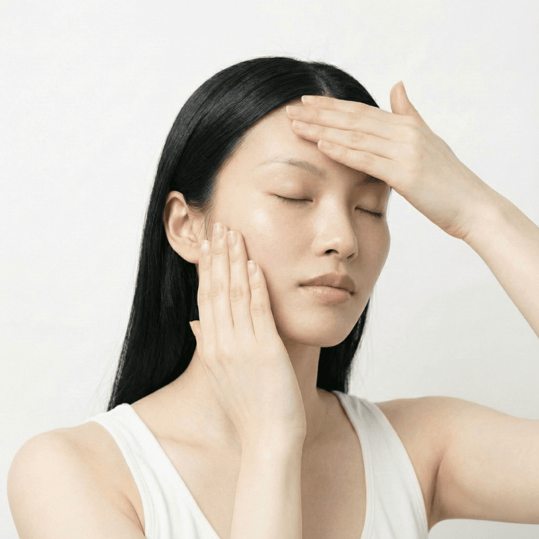 頬から外側へ3回、やさしく押さえるようになじませます。